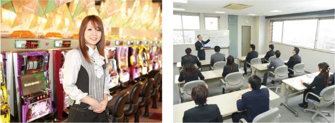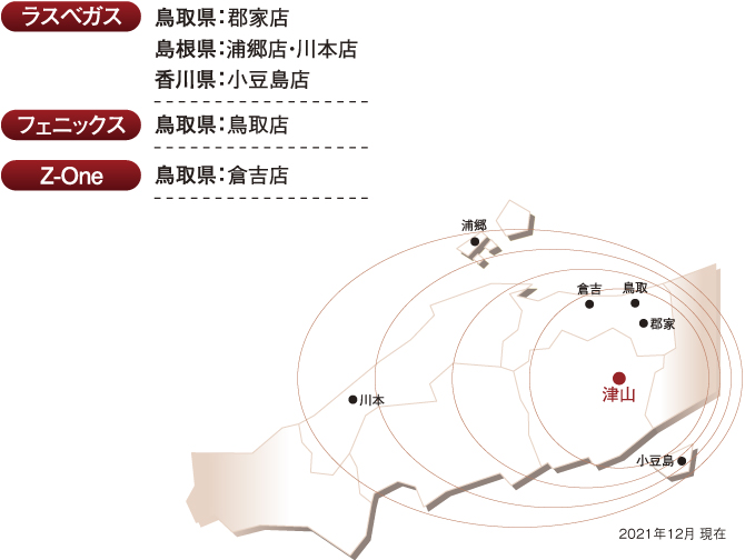 全秦通商が手掛けるアミューズメント事業。その中核を成しているのがパチンコ事業です。現在、岡山・鳥取・島根・兵庫・香川県で店舗展開しています。近年、パチンコは年齢・性別を問わず気軽に楽しめる娯楽として広く認知されてきました。特に娯楽の少ない地方の郊外では地域の皆様の憩いの場として重要なコミュニティのひとつと考えています。地域に根ざし長い間ご愛顧いただくためには、ハード面に頼るのではなくソフト面の充実が何より大切です。「非日常の刺激・やすらぎ」を提供するためには、勝敗や遊技機といった要素もさることながら、「居心地の良い」店であることが重要だと考えています。全秦通商ではお客様ひとり一人に対する細やかな心配りと親しみのある接客など、さまざまな機会を通じて満足をお届けしています。また、時代の変化とともに多様化するお客様のニーズにいち早くお応えするため、気軽に遊べる低貸玉のバリエーションも増やしており、地域密着型店舗ならではの強みを活かして店舗展開を進めています。