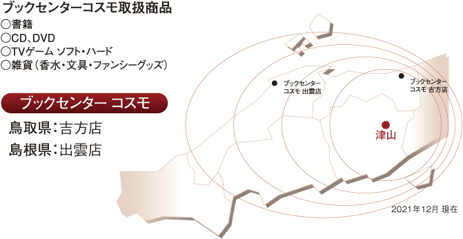 知的好奇心を満足させる書籍、心の栄養となる音楽や映像、そして遊び心を熱くさせるテレビゲーム・・・。これらのメディアは時代のムーブメントを反映するものであり、世の中の動きに敏感な人々の関心と注目を常に集めています。全秦通商のカルチャー部門となるブックセンターコスモは、書籍・雑誌・コミックを中心にCD・DVD、テレビゲーム、文具・雑貨を取り扱うマルチメディアショップとして、現在、岡山・鳥取・島根に展開。地域の情報発信拠点としての役割を自覚し、厳選したタイトルセレクトによる品揃えで最新ニーズにタイムリーにお応えしています。
